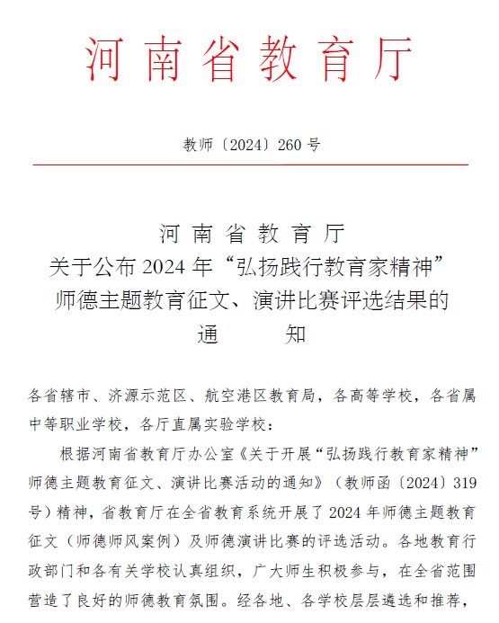 日前,从省教育厅传来喜讯,我校在河南省教育厅开展的“弘扬践行教育家精神”师德主题教育征文活动中再获佳绩,斩获一等奖1项、二等奖1项、三等奖2项。